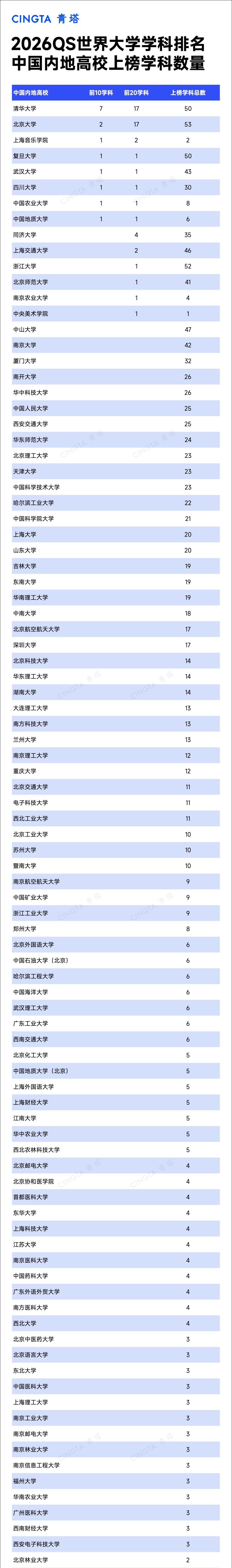 2026年QS世界大学学科排名中,中国内地共有15个学科跻身全球前十,较2021年的7项实现翻倍增长。清华大学拥有7个全球前10学科,数量上领跑内地高校。