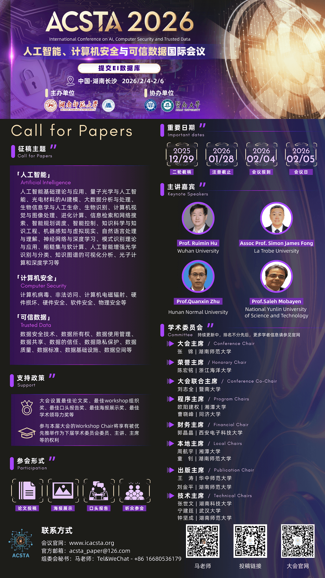 人工智能、计算机安全与可信数据国际会议(ACSTA 2026)将于2026年2月4日至6日在中国长沙召开。本届会议由湖南师范大学、湖南省机器人与人工智能推广学会主办,湘潭大学、暨南大学协办。会议设有主旨演讲、专题研讨及论文报告环节,汇聚全球顶尖学者、业界专家及从业者,共同交流人工智能、计算机安全与可信数据等领域的最新突破,促进医疗、制造等行业的实际AI解决方案落地。