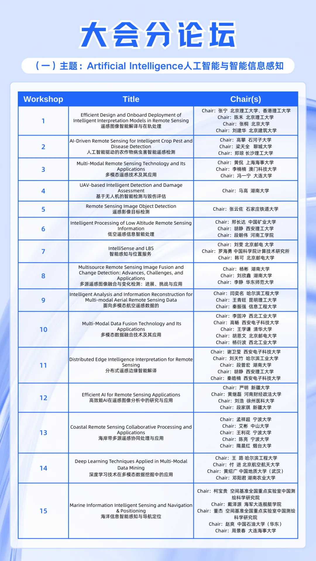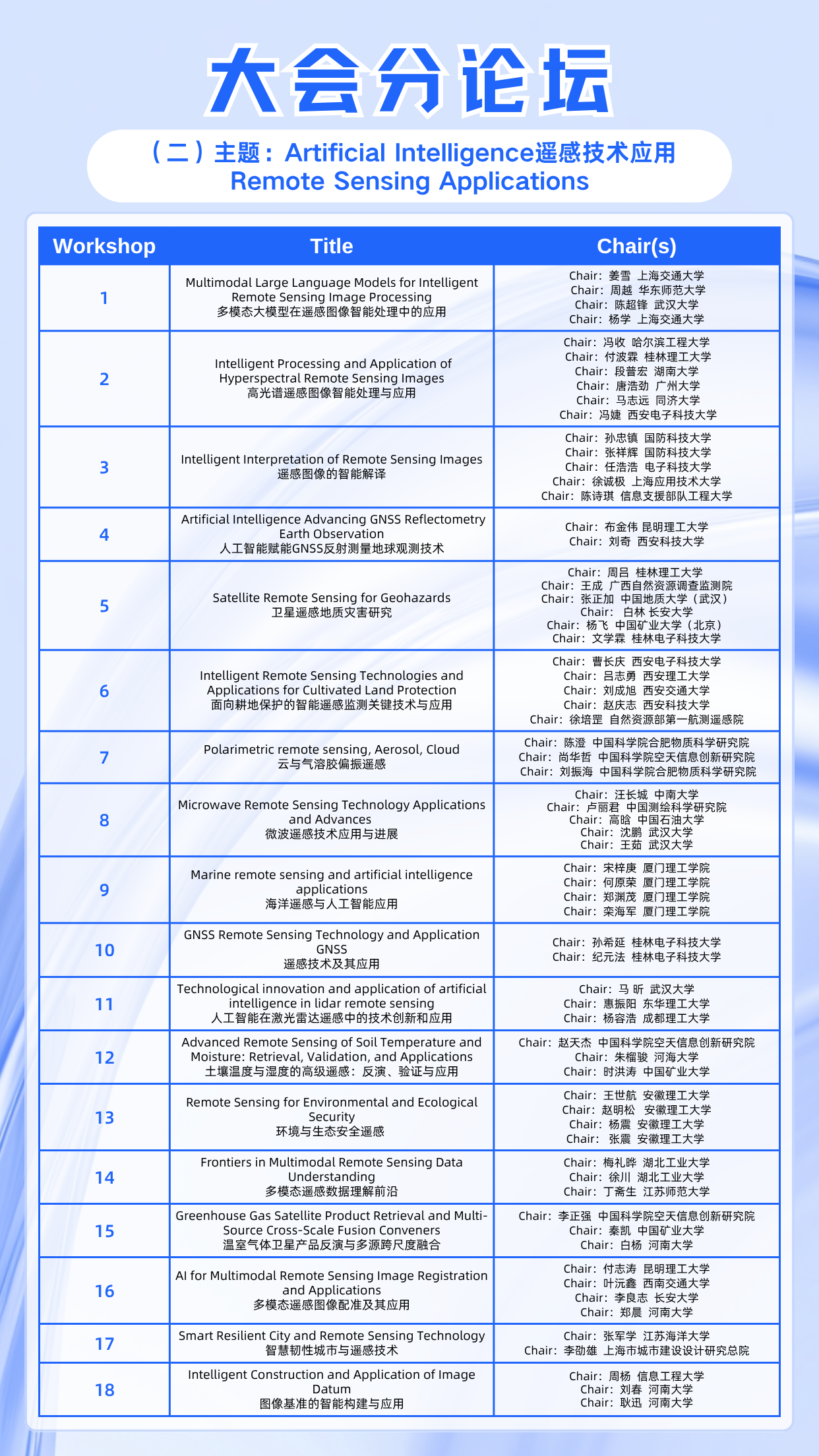 人工智能技术在遥感和空间科学应用中的应用、无人机遥感与低空遥感网络、数字孪生与智慧城市、气候变化与碳循环遥感、近实时遥感与应急响应、AI 驱动的高分辨率遥感影像智能解译、数据驱动的遥感应用农业、生态系统和水文遥感、海洋、海冰、沿海水域和大型水体遥感、大气遥感、地球资源与环境遥感/GIS 应用、遥感技术及其在城市环境中的应用、智能交通、机器人导航与定位、物联网和数字化转型在遥感应用中的应用、卫星图像处理与数字数据分析等。