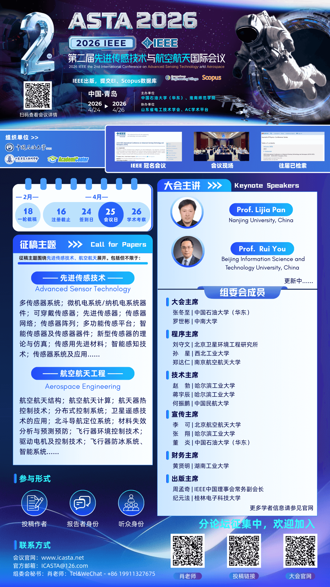 IEEE 2026 第二届先进传感技术与航空航天国际会议(ASTA 2026)将于2026年4月24日-26日在中国青岛盛大举行,由中国石油大学(华东)、淮南师范学院主办,AC学术平台协办。本届会议为IEEE冠名会议,收录的文章均会提交IEEE出版并提交EI数据库。