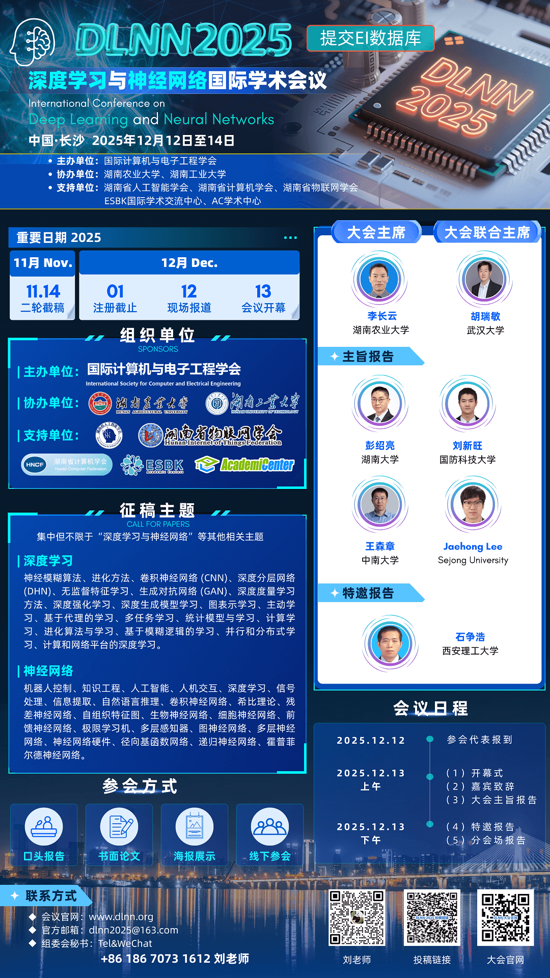 深度学习与神经网络国际学术会议(DLNN 2025)将于2025年12月12日-14日在湖南长沙召开。DLNN作为一个国际论坛,旨在汇聚从事深度学习和神经网络领域工作的院士、科学家、工程师和研究人员,交流观点,分享专业知识、经验和研究成果,并讨论各自专业领域的挑战和未来发展方向。诚邀高校、科研院所、企业等有关方面的专家学者参加会议!