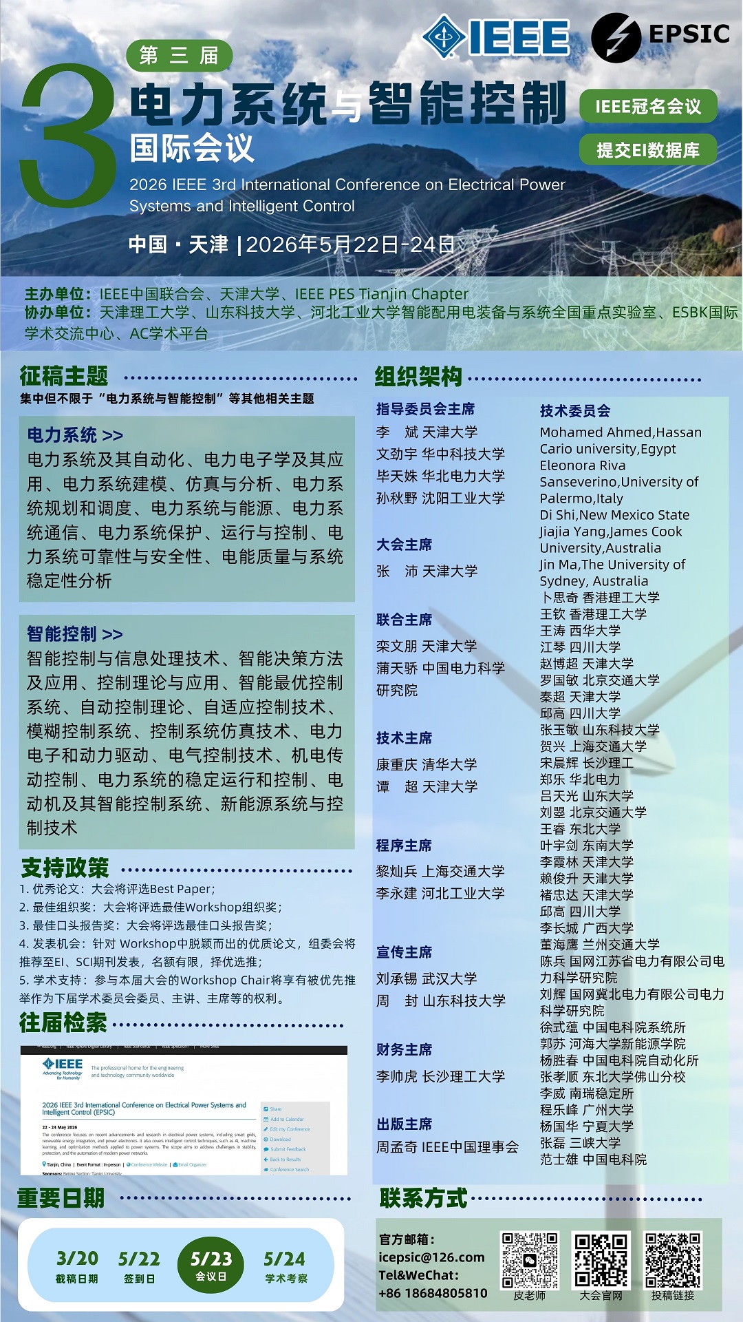 2026年IEEE第三届电力系统与智能控制国际会议(IEEE EPSIC 2026)由IEEE中国联合会、天津大学、IEEE PES Tianjin Chapter主办,将于2026年5月22日-24日在中国·天津盛大举办。