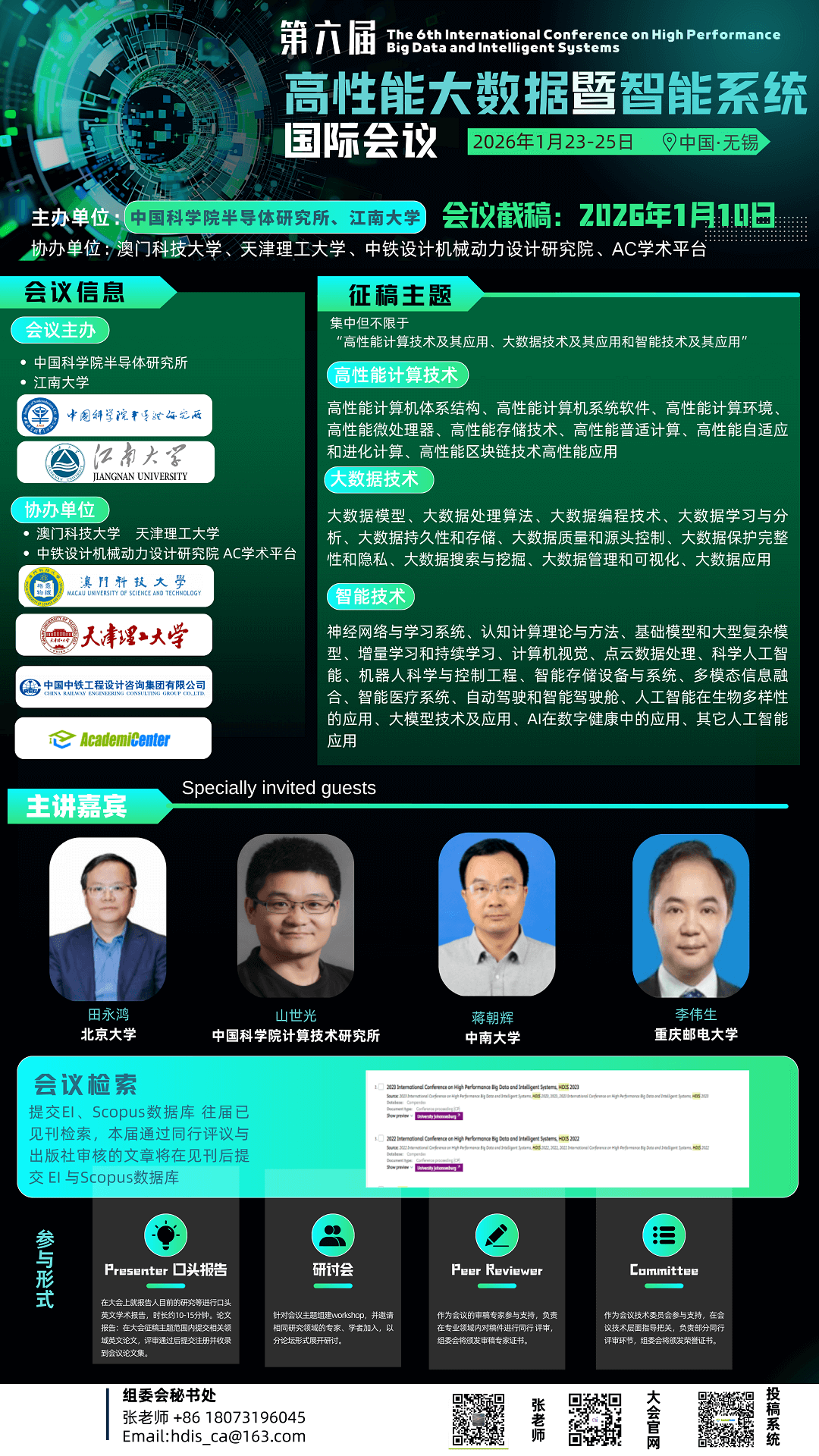 第六届高性能大数据暨智能系统国际会议(HDIS 2025)将于2026年1月23-25日在江苏无锡举行。会议由中国科学院半导体研究所、江南大学主办,澳门科技大学、天津理工大学、中铁设计机械动力设计研究院、AC学术平台担任协办。