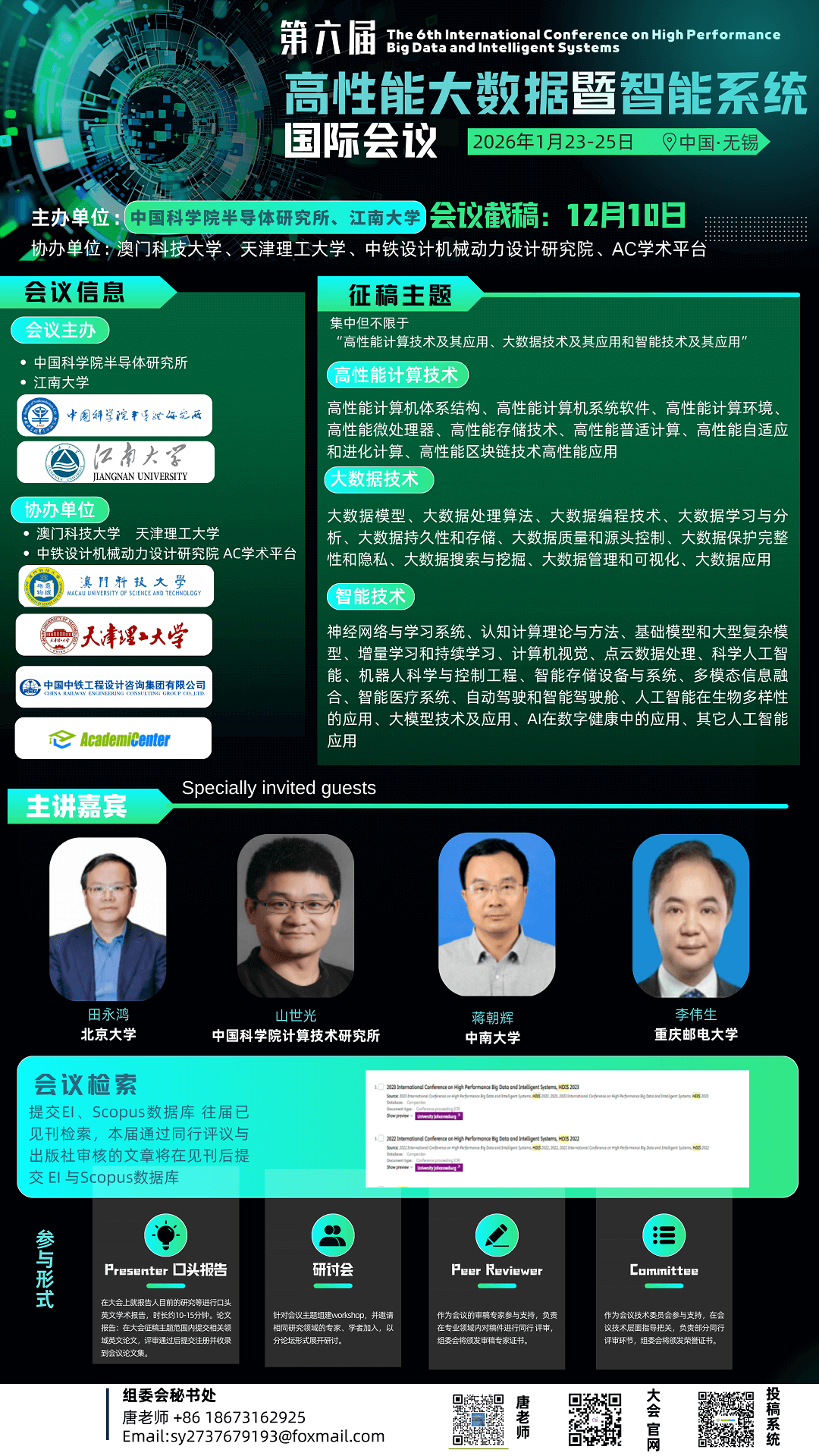 征稿主题:集中但不限于“高性能计算技术及其应用、大数据技术及其应用和智能技术及其应用”等其他相关主题。