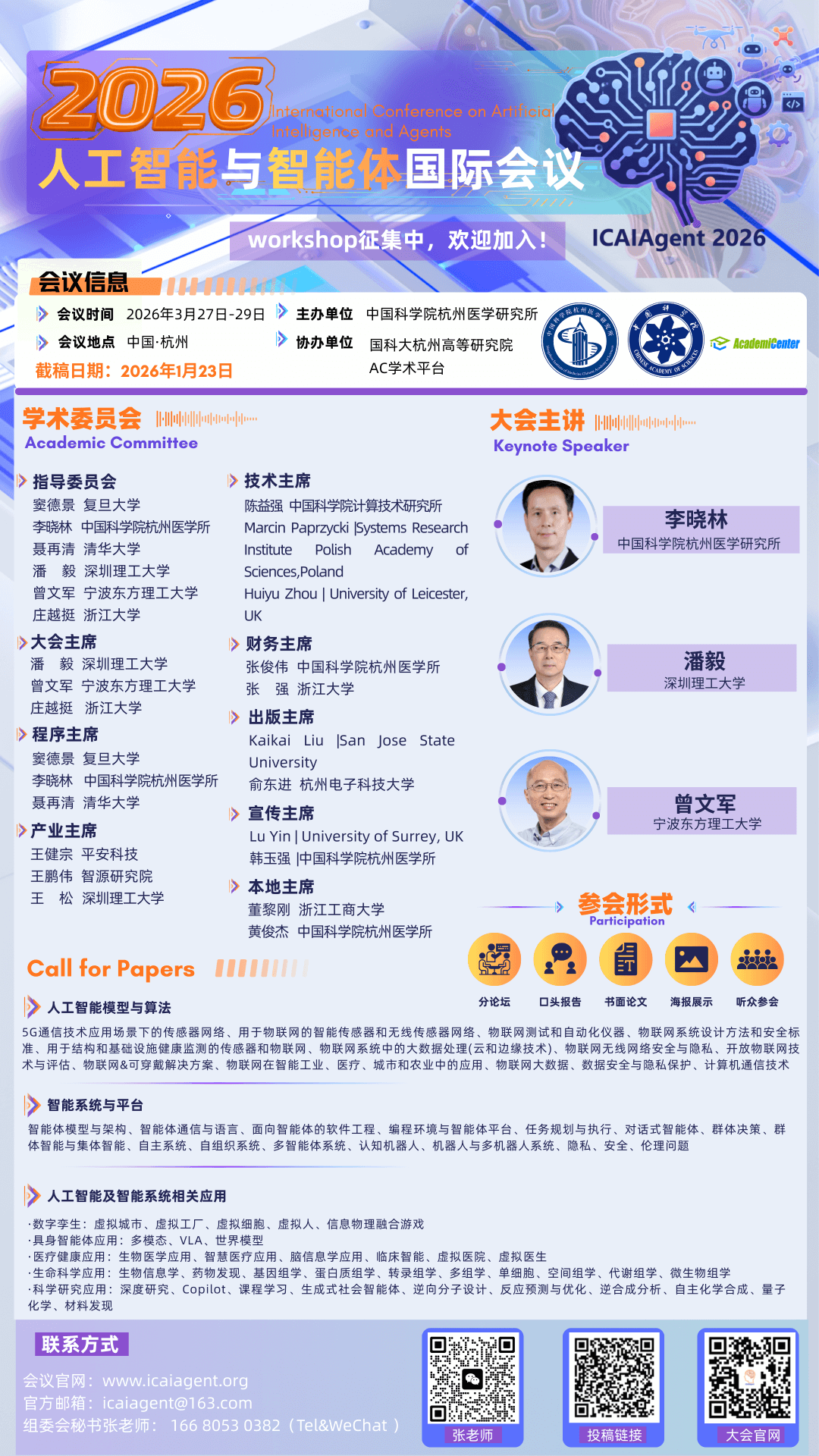 为推动全球人工智能与智能体领域学术交流与技术创新,促进产学研深度融合,搭建高端前沿学术交流平台,为领域菁英提供展示机会,2026年人工智能与智能体国际会议(ICAIAgent 2026)将于2026年3月27-29日在中国杭州隆重召开。