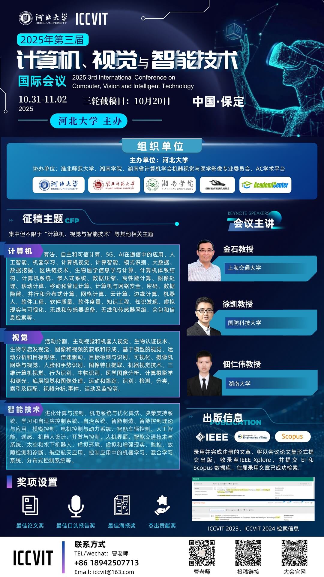2025年第三届计算机、视觉与智能技术国际会议(ICCVIT 2025)将于2025年10月31日-11月2日在中国保定召开。ICCVIT 2025已成功列入IEEE列表会议,由IEEE北京分会提供技术支持。会议聚焦计算机、视觉和智能技术,旨在为专家、学者和研究人员提供一个国际平台,分享研究成果,讨论问题和挑战,探索前沿技术。诚邀高校、科研院所、企业等有关方面的专家学者参加会议。