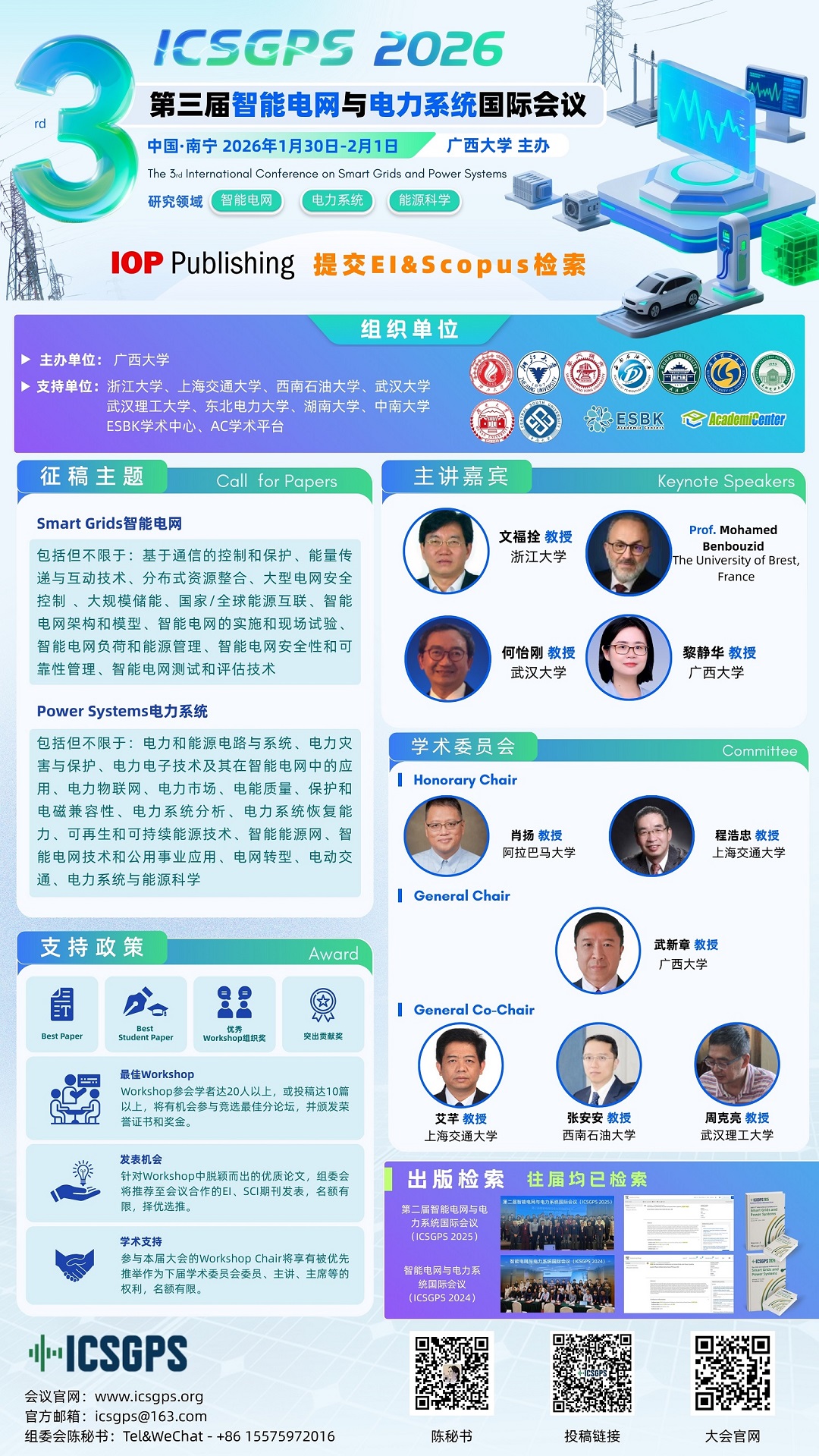 第三届智能电网与电力系统国际会议(ICSGPS 2026)由广西大学主办,由浙江大学、上海交通大学、西南石油大学、武汉大学、武汉理工大学、东北电力大学、湖南大学、中南大学、ESBK学术中心、AC学术平台联合支持,于2026年1月30日-2026年2月1日在中国南宁举行。在本次会议上发表的文章将会被本次会议所录用,论文将由IOP国际出版社出版,并提交EI核心索引。