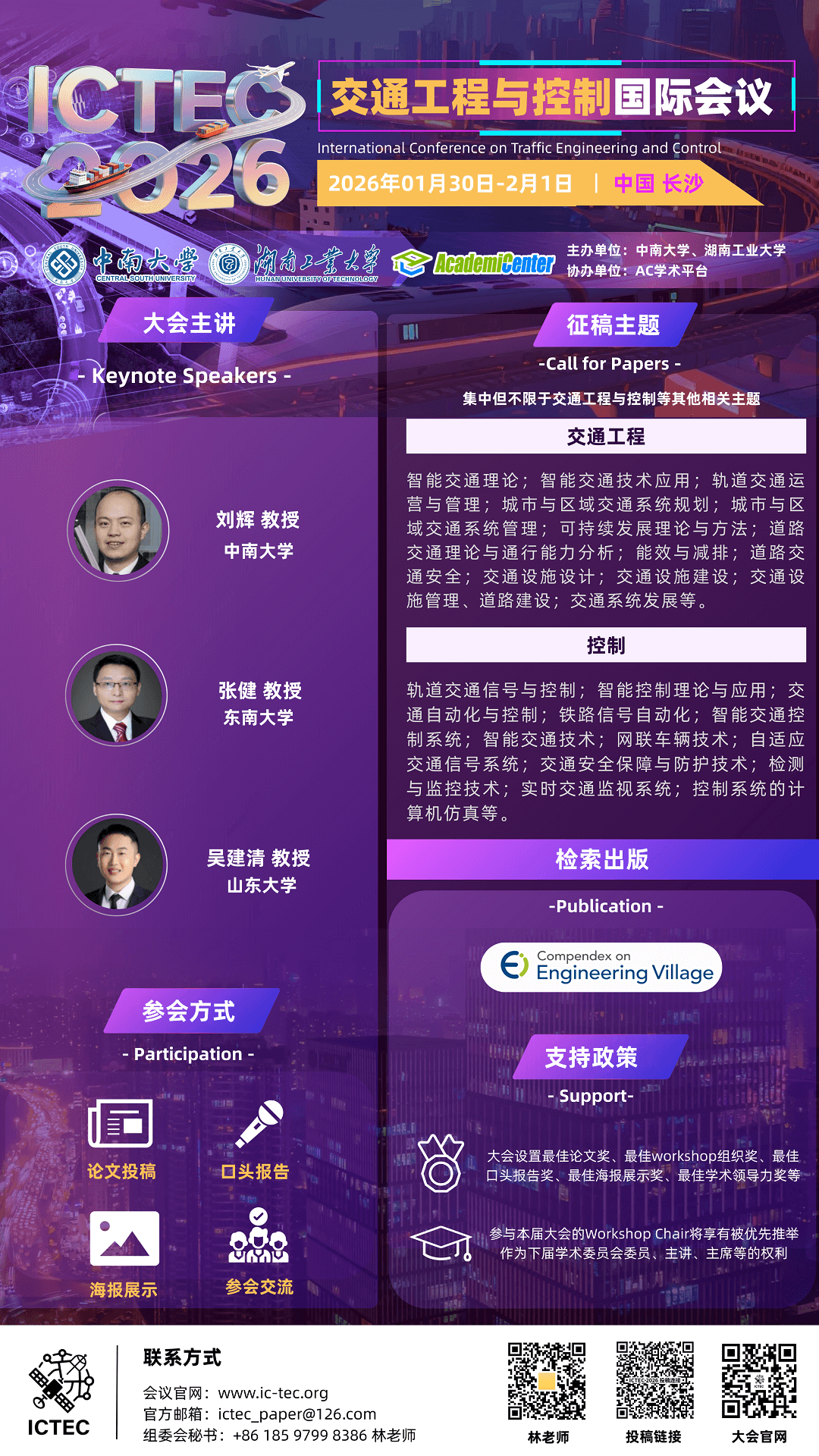 2026年交通工程与控制国际学术会议(ICTEC 2026)将于2026年01月30日至02月01日在中国·长沙盛大召开。本届会议由中南大学与湖南工业大学主办,AC学术平台联合支持。