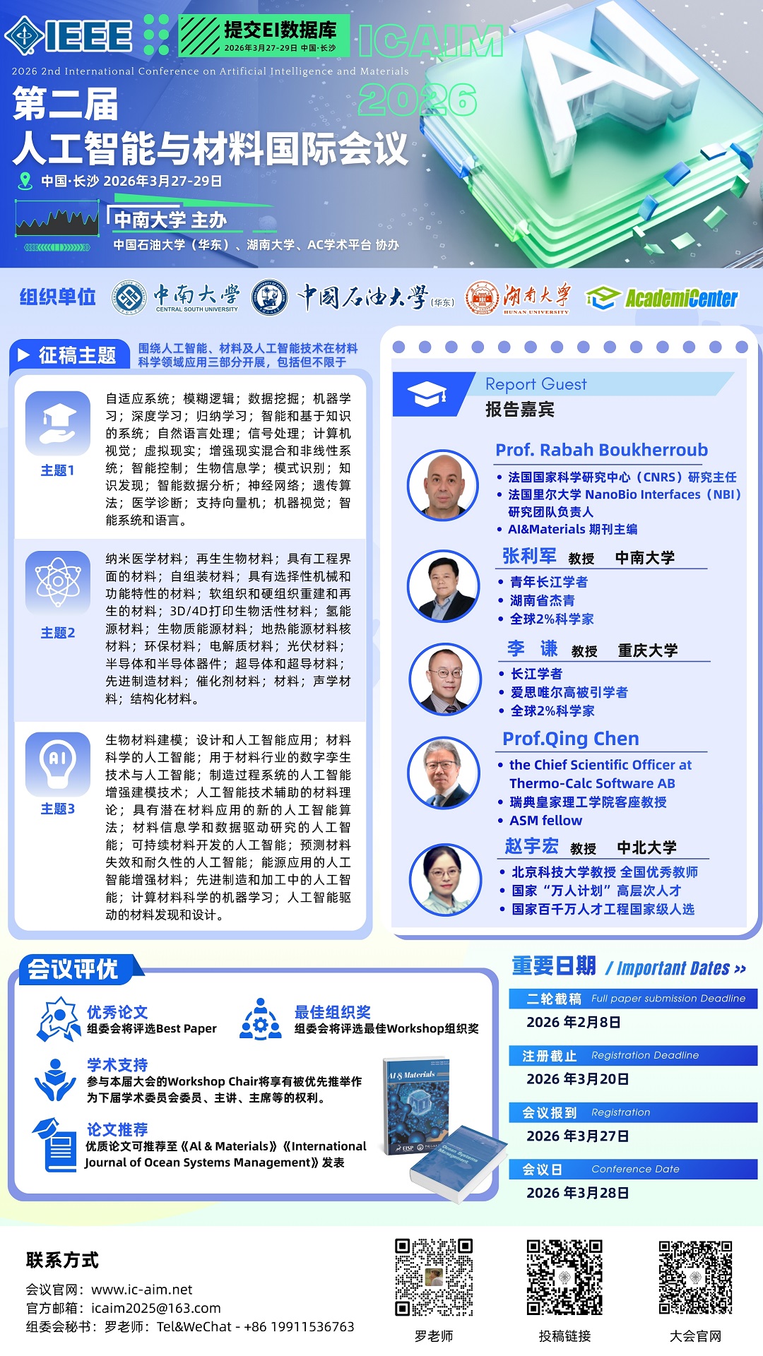 第二届人工智能与材料国际学术会议(ICAIM)由IEEE冠名,IEEE北京分会、中南大学主办,中国石油大学(华东)、湖南大学协办,将于2026年3月27-29日在中国长沙盛大开幕,组委会诚挚地邀请您拨冗出席。