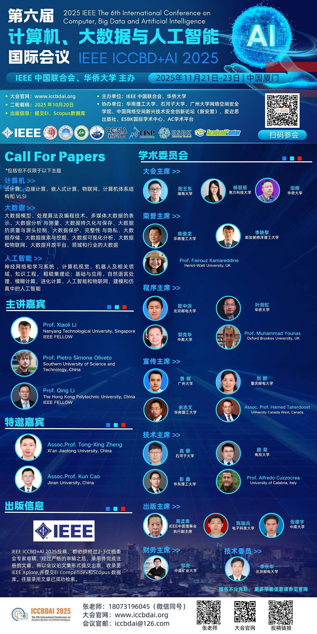 2025年IEEE第六届计算机、大数据与人工智能国际会议(IEEE ICCBD+AI 2025)将于2025年11月21日至23日在中国厦门召开。本届会议由IEEE中国联合会、华侨大学主办,华南理工大学、石河子大学、广州大学网络空间安全学院、中国网络空间新兴技术安全创新论坛(新安盟)、爱迩思出版社、ESBK国际学术中心、AC学术平台协办。会议将围绕计算机、大数据和人工智能等相关研究领域特邀国内外数位在此领域学术卓越的学者专家做相关致辞与报告。