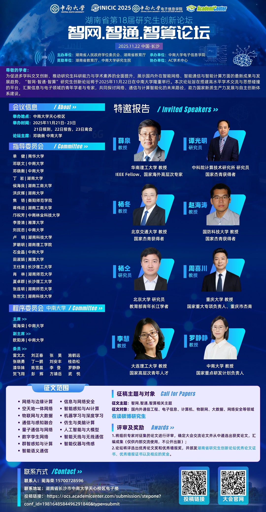 为促进多学科交叉创新、推动研究生科研能力与学术素养的全面提升,展示国内外在智能网络、智能通信与智能计算方面的最新成果与发展趋势,“智网·智通·智算”研究生创新论坛将于2025年11月22日在中南大学隆重举行。本次论坛旨在搭建高水平学术交流与思想碰撞的平台,汇聚信息与电子领域的青年学者与专家,共同探讨网络、通信与计算智能化的未来路径,助力国家新质生产力发展与自主创新体系建设。