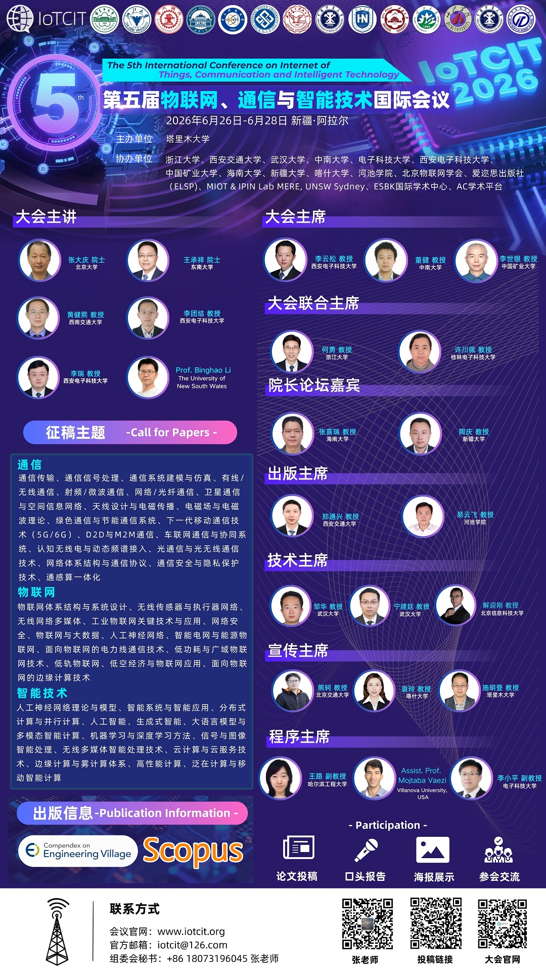 2026年第五届物联网、通信与智能技术国际会议(IoTCIT 2026)拟定于2026年6月26日-6月28日在新疆阿拉尔市盛大举行,由塔里木大学主办,浙江大学、西安交通大学、武汉大学、中南大学、电子科技大学、西安电子科技大学、中国矿业大学、海南大学、新疆大学、喀什大学、河池学院、北京物联网学会、爱迩思出版社(ELSP)、MIOT & IPIN Lab MERE, UNSW Sydney、ESBK国际学术中心、AC学术平台共同协办。