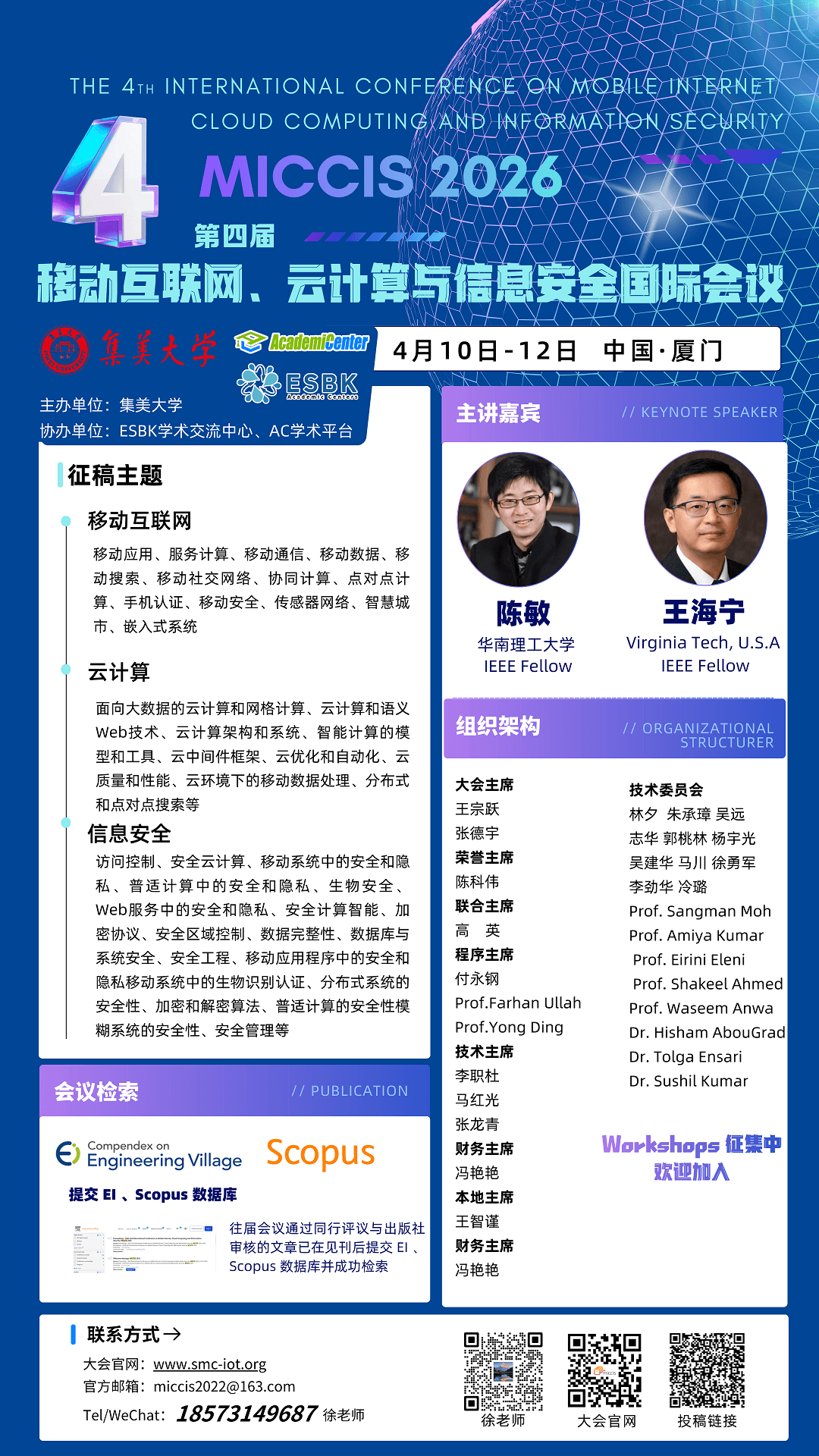 第四届移动互联网、云计算与信息安全国际会议(MICCIS 2026)将于2026年4月10日-12日在中国厦门盛大举行。会议由集美大学主办,ESBK学术交流中心、AC学术平台协办。