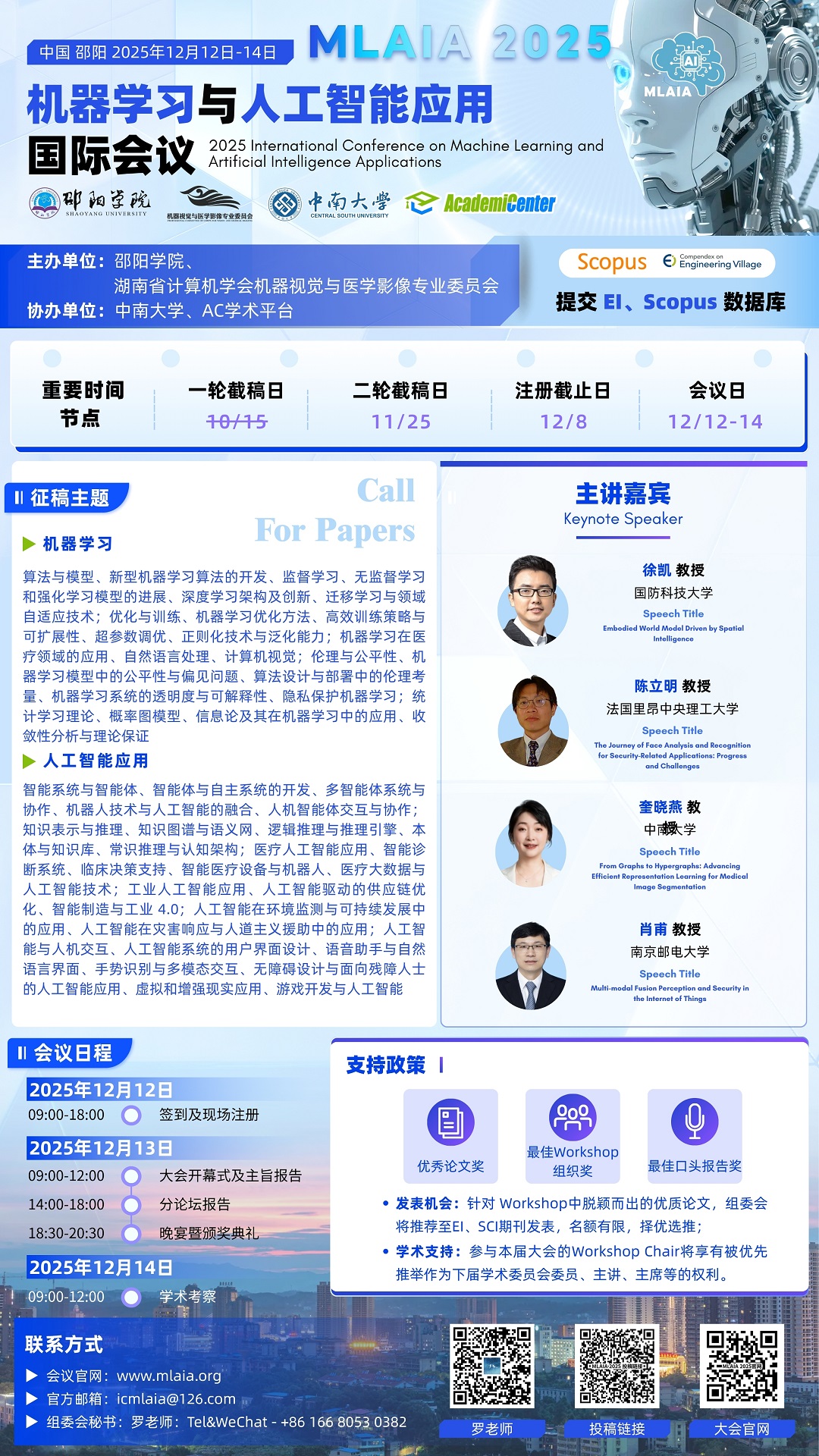 机器学习与人工智能应用国际会议(MLAIA 2025)将于2025年12月12日-14日在中国·邵阳隆重举行。本次大会由邵阳学院和湖南省计算机学会机器视觉与医学影像专业委员会主办,中南大学和AC学术平台协办。会议收录文章将提交EI数据库,为学者的研究成果提供高质量的展示平台。