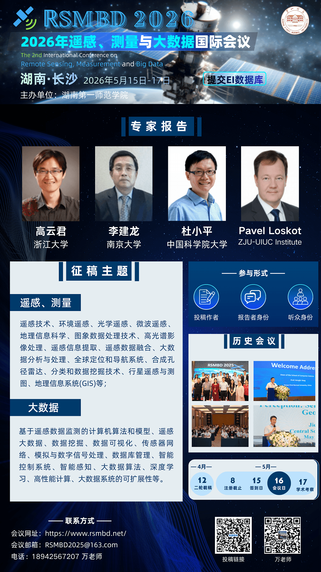 遥感、测量与大数据国际会议(RSMBD 2026)定于2026年5月15日-17日在湖南长沙隆重召开。会议录用并正式发表的论文,将全文收录于RSMBD 2026会议论文集,同步提交至EI数据库进行检索,为相关研究成果提供权威的学术展示与传播平台。