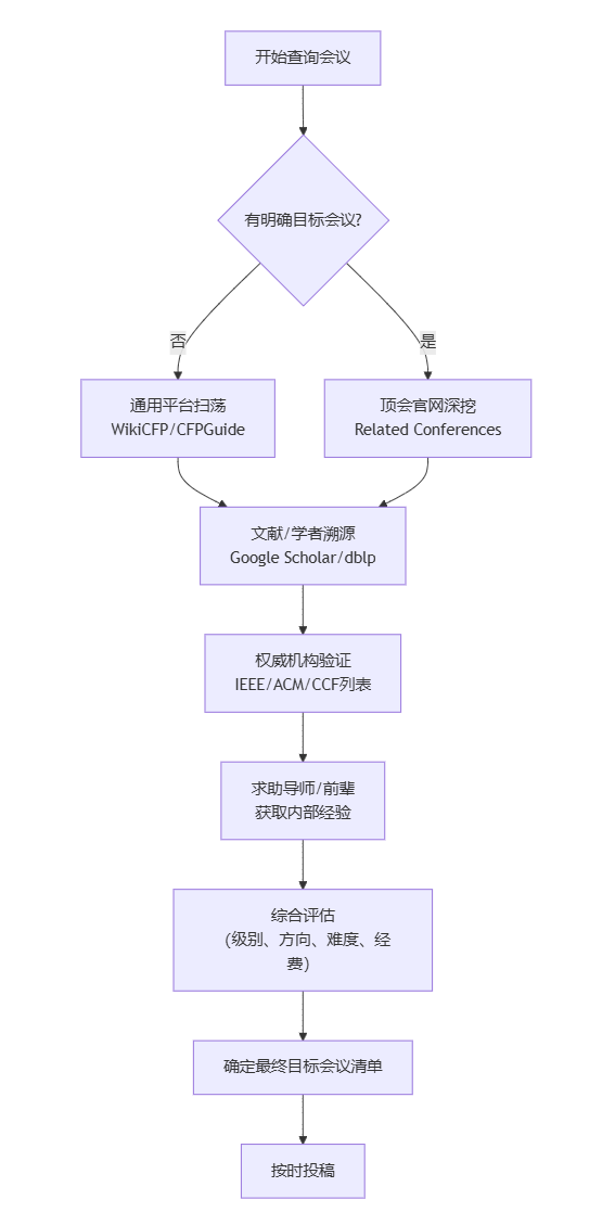 1. 先定标,再搜索: 先通过导师和CCF等列表确定2-3个你领域内的B类或C类会议作为“保底”或“目标”,然后去上述平台关注它们的CFP。