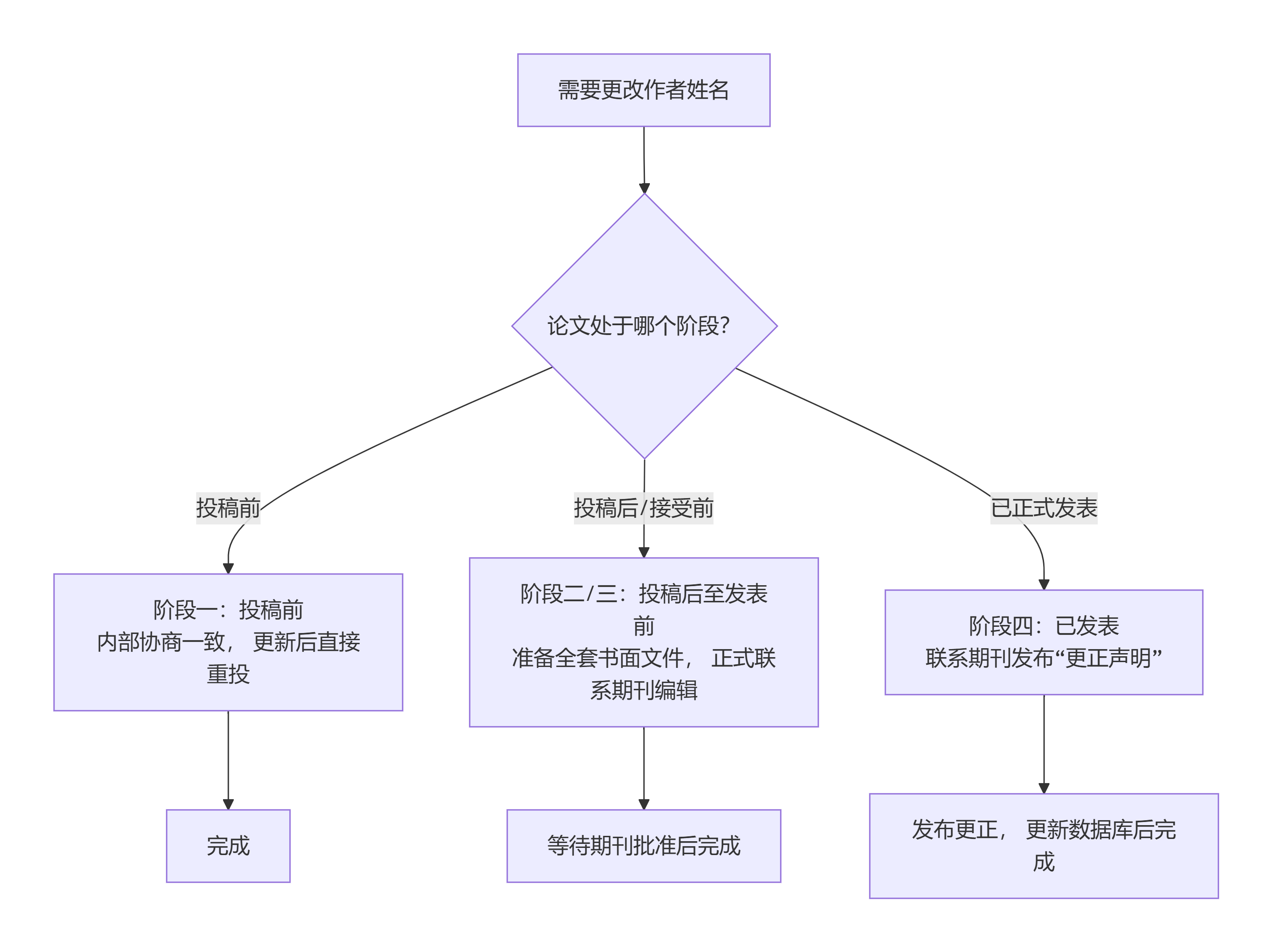 处理方式与阶段二类似,但时间更紧迫。立即联系期刊编辑,提供全套证明文件。期刊可能会推迟发表以处理此变更。