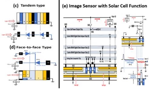 image: Single junction type (a) and the proposed double junction type (b) solar cells are compared with the conventional TANDEM type (c) and the proposed face-to-face type (d) multi-junction connections. A cross-sectional view of a new AI Robot Vision chip in 3DIC multichip architecture.(e) shows one-pixel unit of a unique high-performance image sensor unit, with the solar cell capability, which is composed of a pinned-surface buried-channel P+PNPP+ double junction photodiode with an in-pixel source-follower current-amplifier, and also with a depletion MOS type charge transfer gate (CTG) and another depletion MOS type pre-charging gate (PCG) with a switching outlet diffusion drain (ODD) region, for draining out the photo signal electrons.