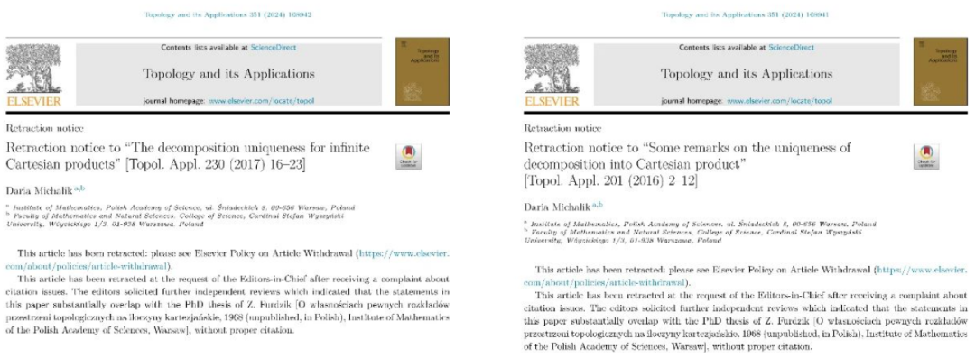 2024年5月23日,一名来自波兰的数学教授Daria Michalik 的两篇SCI论文被撤稿!