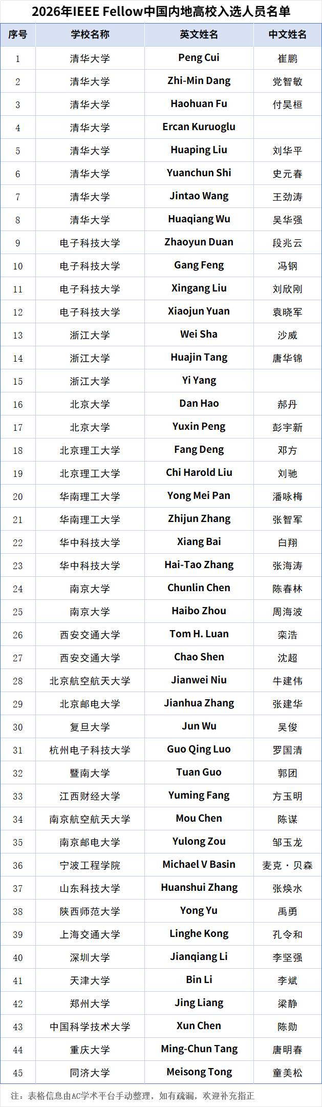 2026年IEEE Fellow中国内地高校入选人员名单如下:
